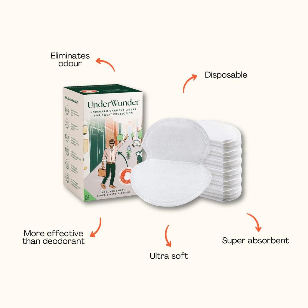 UnderWunder Garment Liners are disposable, fabric pads that attach to your garment sleeve, designed to absorb sweat & odour from the armpits, keeping you fresh and dry when your deodorant fails.